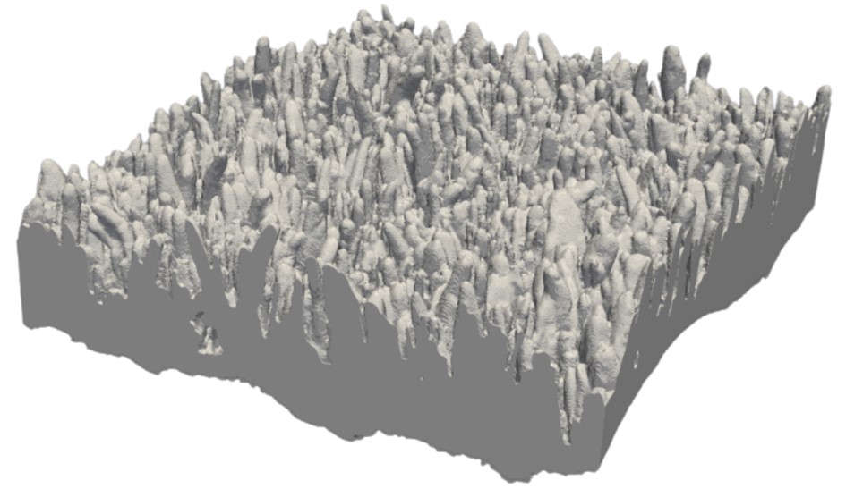Ce volume a été obtenu par tomographie aux rayonnements synchrotron in situ, effectuée à l’ESRF (ligne ID11). Le présent cliché présente la couche de composé intermétallique segmentée dans un cube d’un millimètre de côté (taille de voxel : 1 μm).