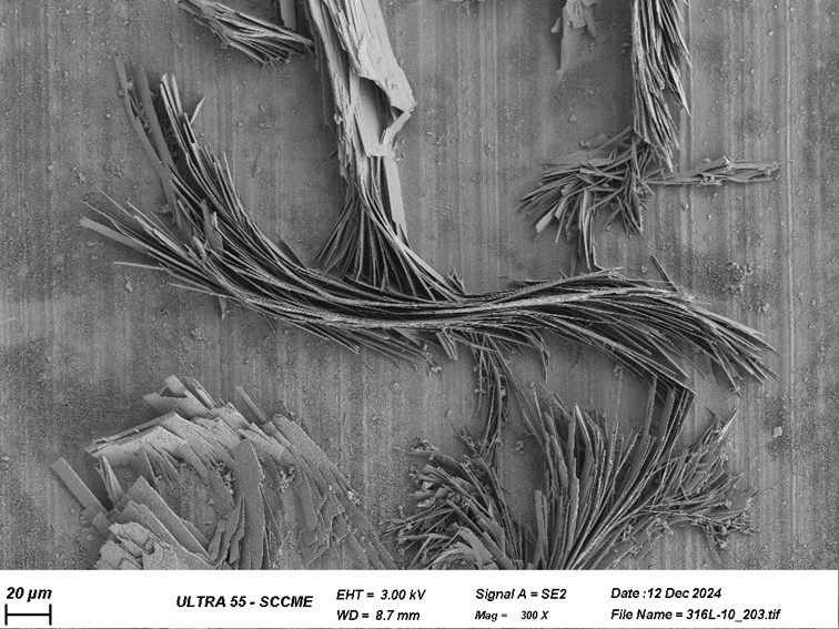 Il s’agit d’un échantillon en acier inoxydable, qui a été exposé en milieu aqueux et en température. On peut observer les plaquettes qui forment la couche de corrosion externe.