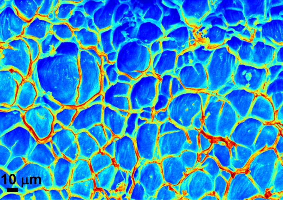 Cette image représente le réseau d’un hydrogel de chitosan congelé par immersion dans l’azote liquide puis lyophilisé sous une pression de 0,3mbar durant deux jours et recouvert en surface par une couche de 5mm de particules d’or. Le cliché expérimental obtenu par microscopie électronique à balayage est analysé par intelligence artificielle pour coloration en fonction des niveaux de gris de l’image initiale pour mieux visualiser les pores et le réseau.