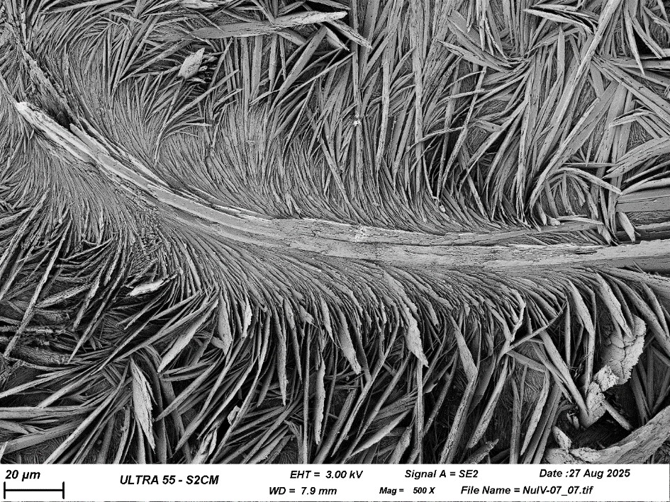 Cette micrographie présente la morphologie de la couche de produits de corrosion externe d’un échantillon en acier faiblement allié après exposition en milieu secondaire en température. Ce cliché présente des produits de corrosion en plaquettes plus ou moins homogènement répartis.