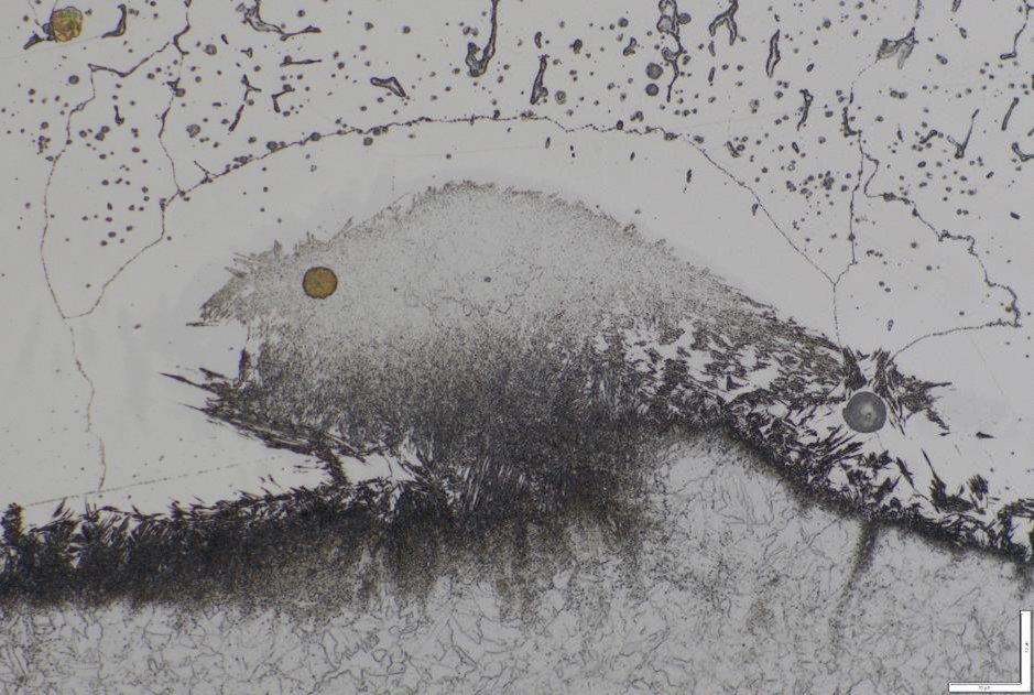 Cette image représente un artéfact de préparation (au niveau de « l’œil » du poisson) situé dans la bande de dilution au niveau de la zone de liaison entre un acier faiblement allié et un acier inoxydable déposé par soudage.