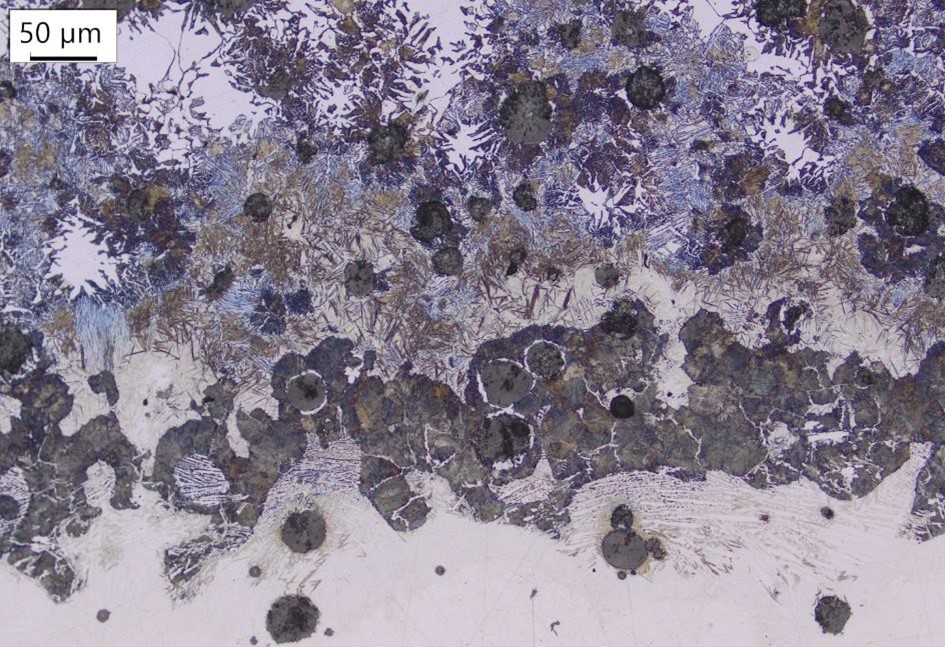 Cette image illustre l’interface entre une fonte à graphite sphéroïdal et un alliage de Fer-Nickel déposé par procédé de fabrication additive arc-fil (WAAM). La zone inférieure correspond à l’alliage déposé, la partie supérieure révèle la microstructure de la fonte, avec des zones fondues et affectées thermiquement situées à l’interface. Cette image fait partie de mon travail de thèse sur la réparation de structures ferroviaires par fabrication additive.