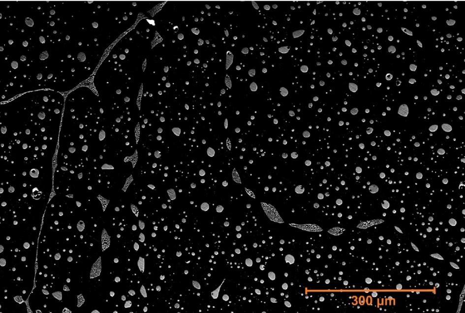 Cette image présente la microstructure d’un alliage Al-10% wt. Cu après un traitement thermique de 25 minutes à 560 °C, au-dessus de la température eutectique, dans le domaine semi-solide. Ce traitement favorise la fragmentation et la globularisation du réseau eutectique interconnecté d’Al-Al₂Cu dans la matrice d’aluminium, ce qui contribue à réduire les concentrations locales de contraintes et à limiter les zones fragiles associées aux particules allongées. Toutefois, la globularisation reste incomplète : certaines particules résiduelles subsistent encore sous forme allongée ou partiellement connectée.