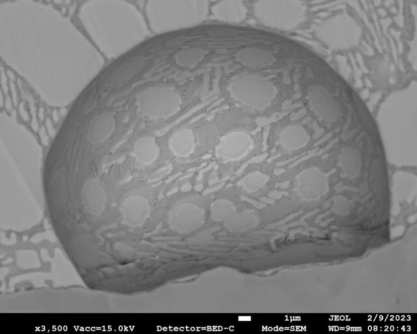 Image d’une bulle dans un alliage ZnAlMg. Ce défaut a entraîné la croissance de dendrites de Zinc tout autour de la bulle. L’étude de cette microstructure donnera des indications sur les causes de la formation de cette bulle.