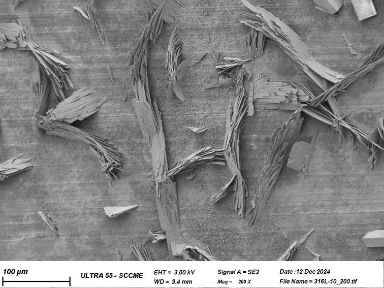 Il s’agit d’un échantillon en acier inoxydable, qui a été exposé en milieu aqueux et en température. On peut observer les plaquettes qui forment la couche de corrosion externe.