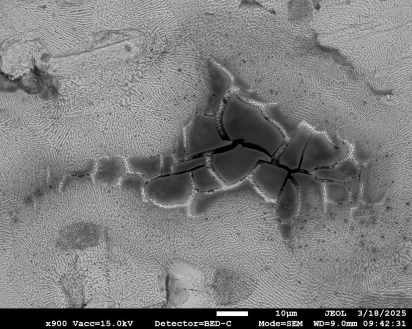 Image d’une forte épaisseur d’e-passivation dans un alliage ZnAlMg. L’alliage est visible à travers les craquelures, et apparaît plus claire. Cette couche protectrice peut parfois complètement masquer des zones d’intérêt.