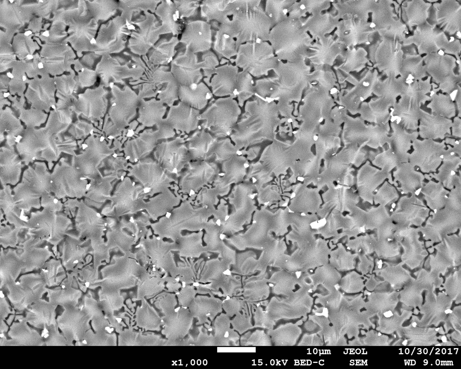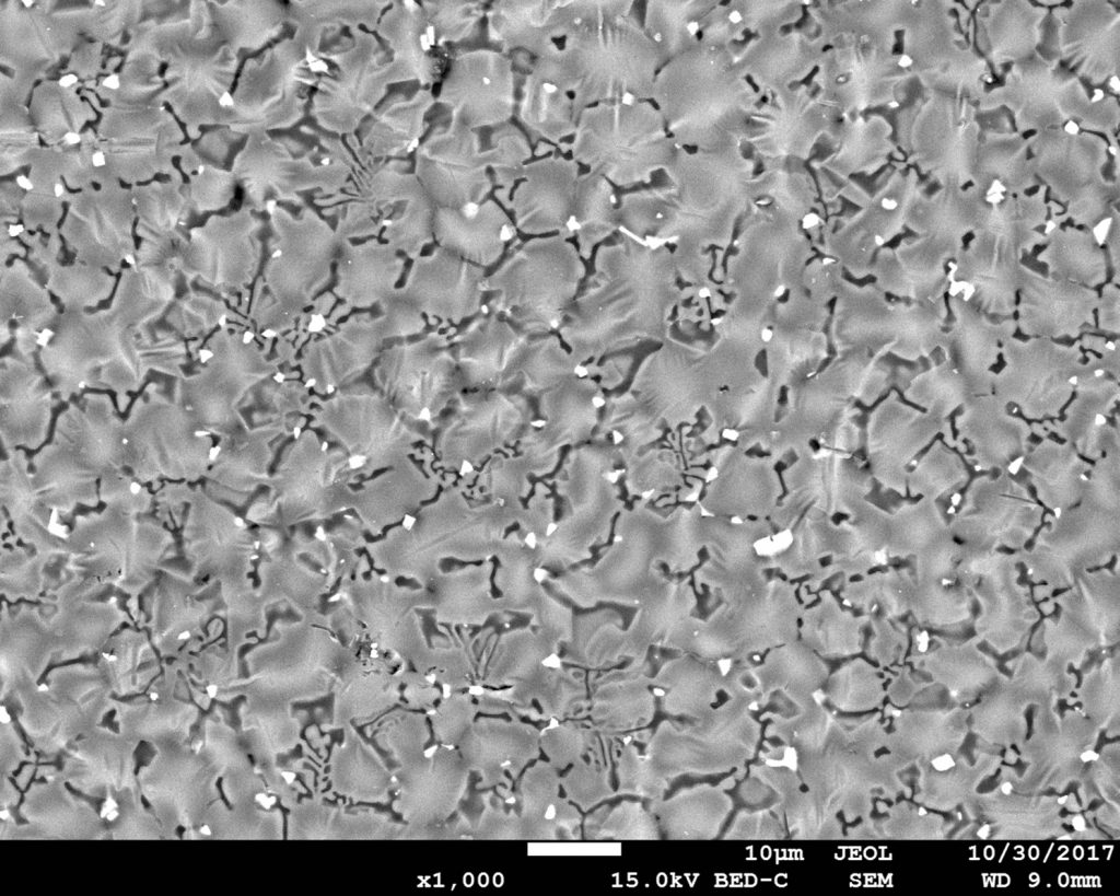 Micrographie réalisée au microscope électronique à balayage (MEB FEG) en électrons rétrodiffusés à une tension d’accélération de 15kV et un grandissement x1000.