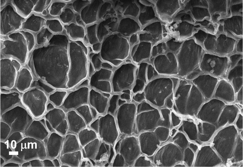 Cette image représente le réseau d’un hydrogel de chitosan congelé par immersion dans l’azote liquide puis lyophilisé sous une pression de 0,3mbar durant deux jours et recouvert en surface par une couche de 5mm de particules d’or. Le cliché expérimental est obtenu par microscopie électronique à balayage.