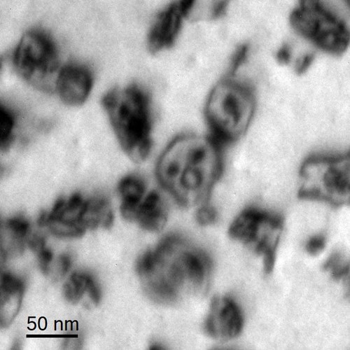 Image réalisée en microscopie électronique en transmission dans une lame mince de Nickel monocristallin irradiée par des ions Ni²+ de 2 MeV (MET FEI Tecnai F20 x62kX).