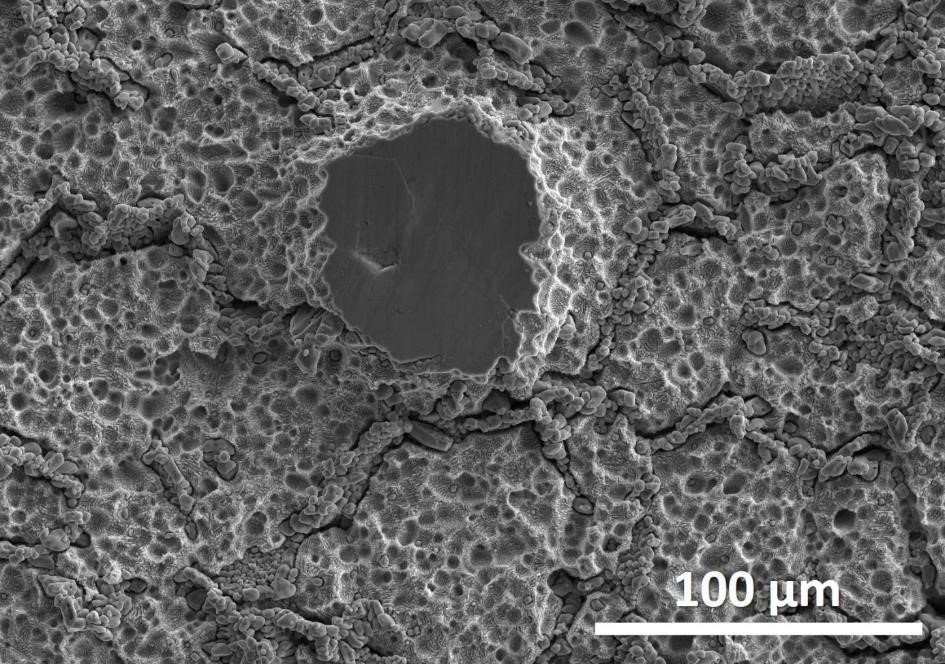 Cette image présente la surface d’une éprouvette de traction en alliage CCA FeCrMnNi après un essai de traction réalisé en présence de l’eutectique Pb-Bi à 500 °C. La surface montre des zones de matériau restées inchangées, des régions corrodées, ainsi qu’une transformation locale des phases menant à la formation de particules, principalement localisées au niveau des joints de grains.